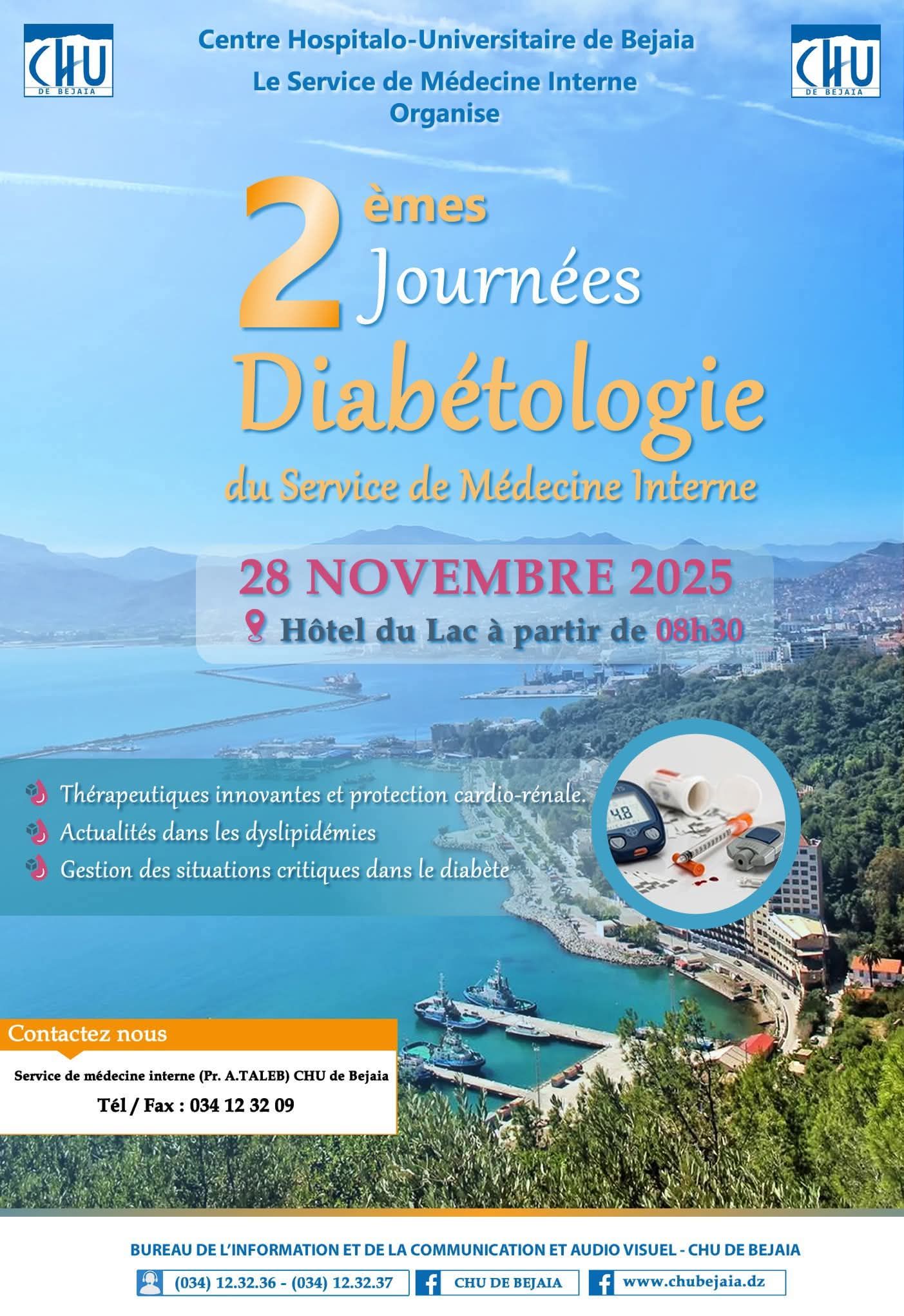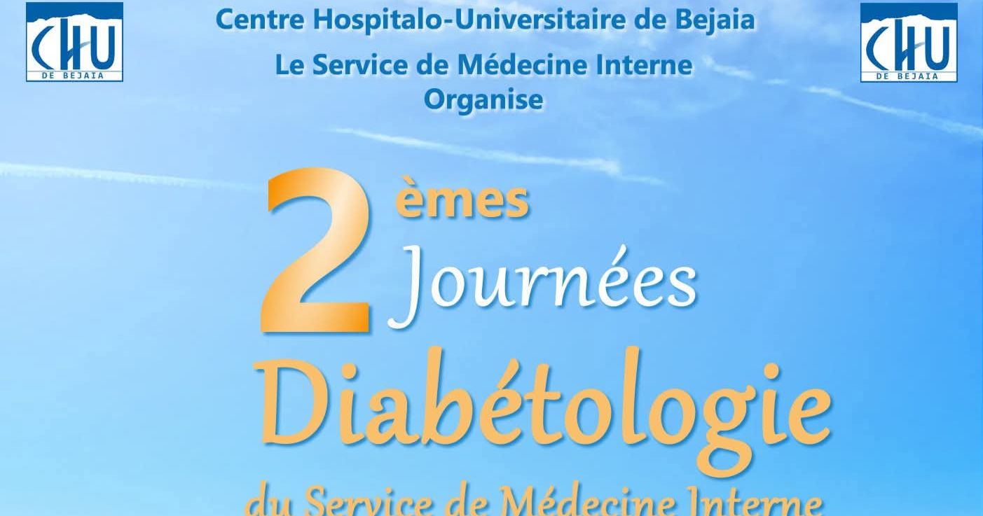 Le service de Médecine Interne du #CHU_de_Béjaïa a le plaisir de vous informer de la tenue de ses 2èmes Journées de Diabétologie, qui se dérouleront :