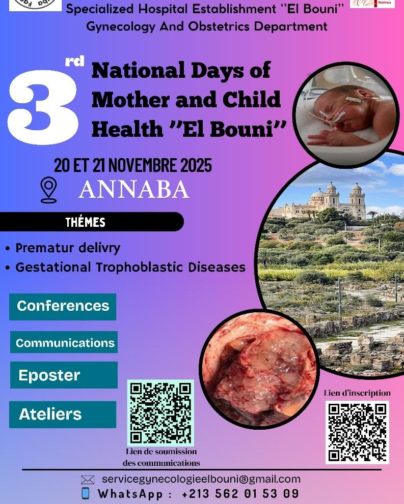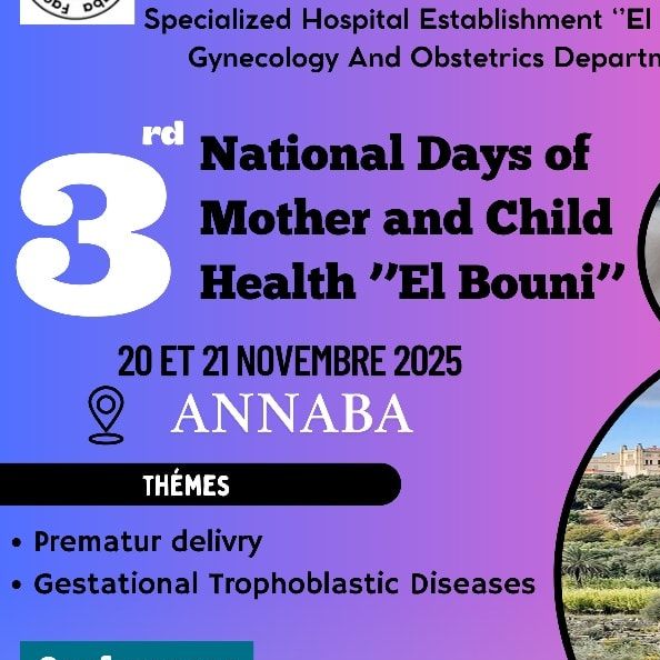 Le service de Gynécologie Obstétrique DE L’EHS El Bouni Annaba a le plaisir de vous annoncer la tenue de ses 3èmes Journées Nationales de la santé de la mère et de l’enfant qui auront lieu les 20 et 21 novembre 2025 à Annaba.