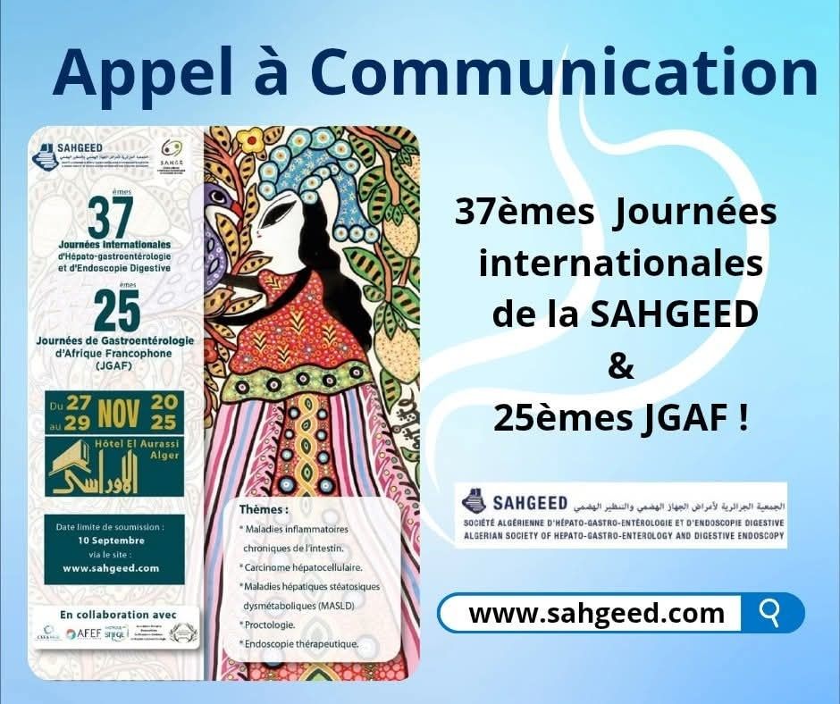 La SAHGEED est très heureuse de vous annoncer l'organisation de ses 37èmes Journées internationales, conjointement avec les 25èmes Journées de Gastroentérologie d’Afrique Francophone (JGAF) !