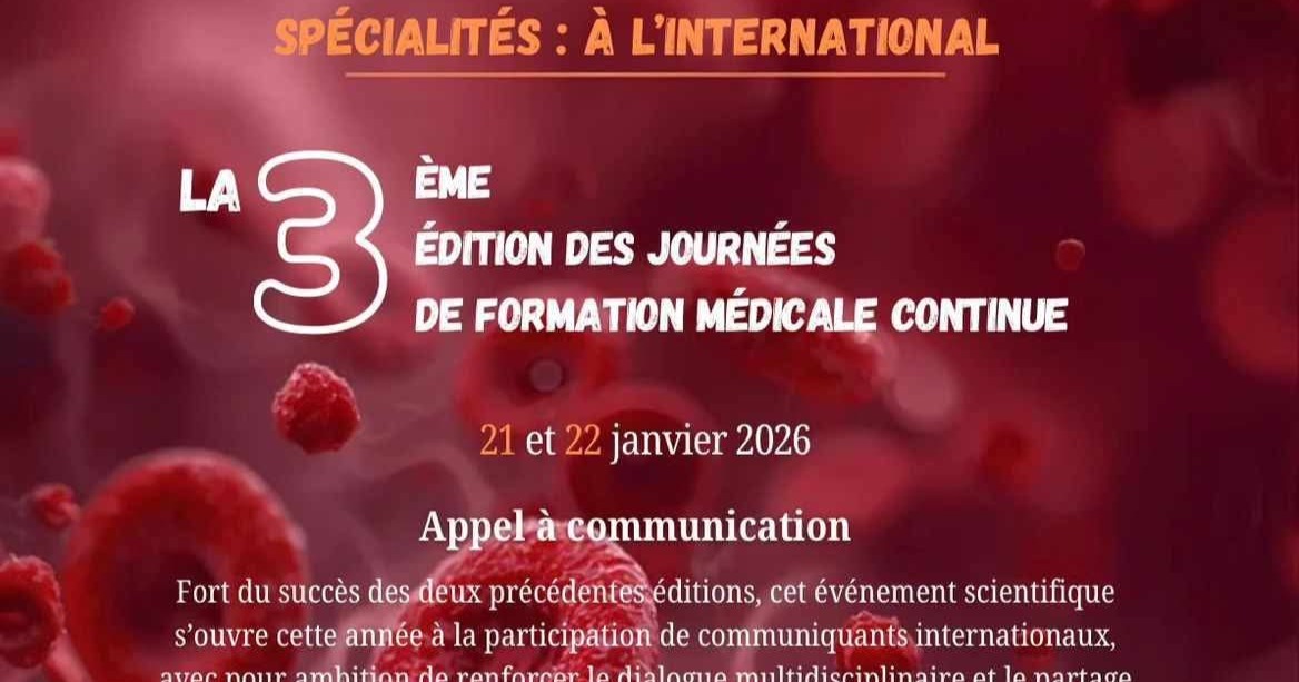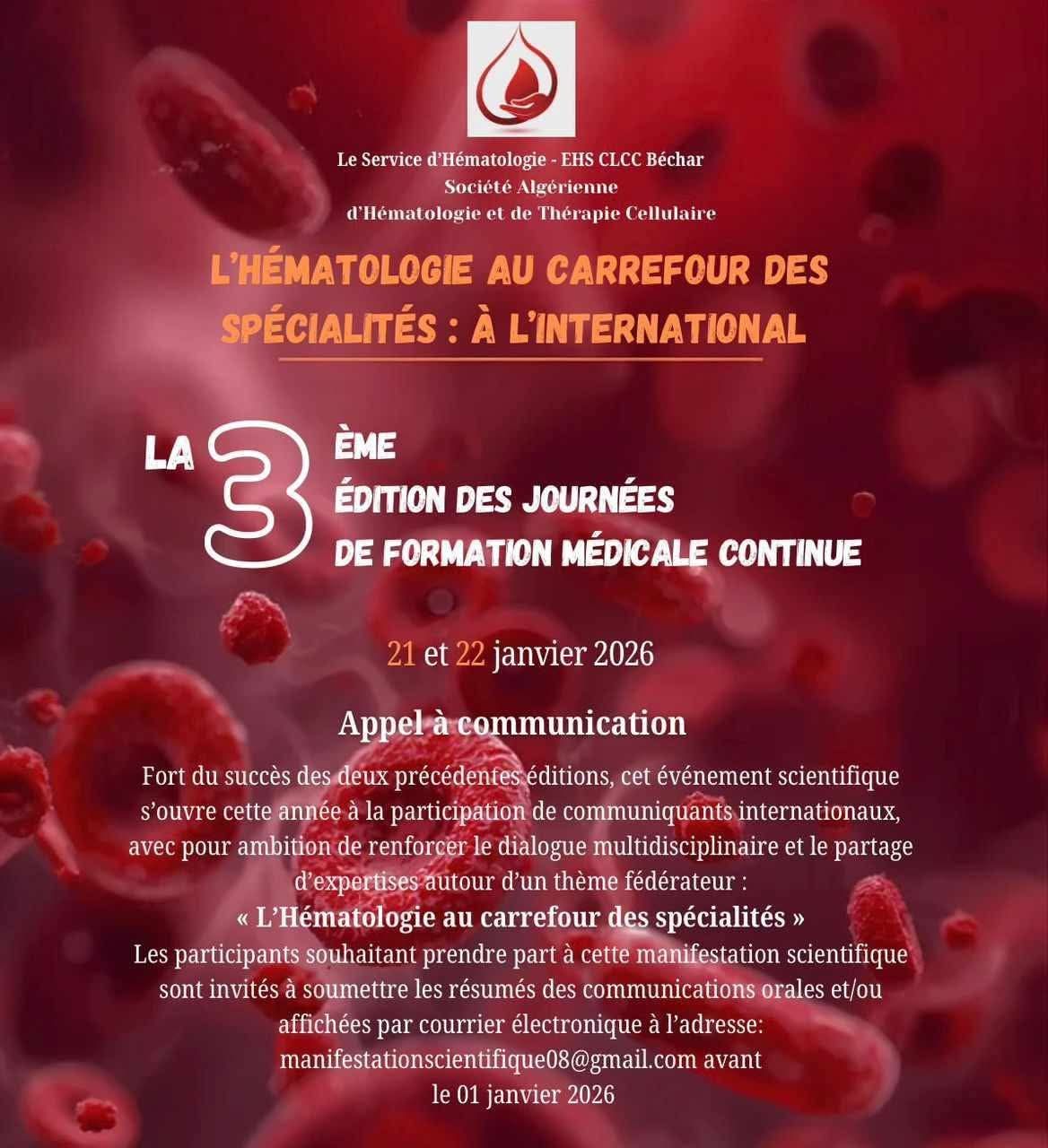 sous l’égide de la Société Algérienne d’Hématologie et de Thérapie Cellulaire , organise la 3ème édition des journées de formation médicale continue, les :