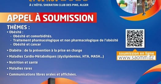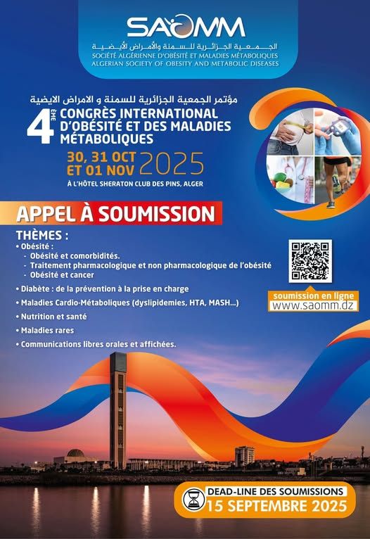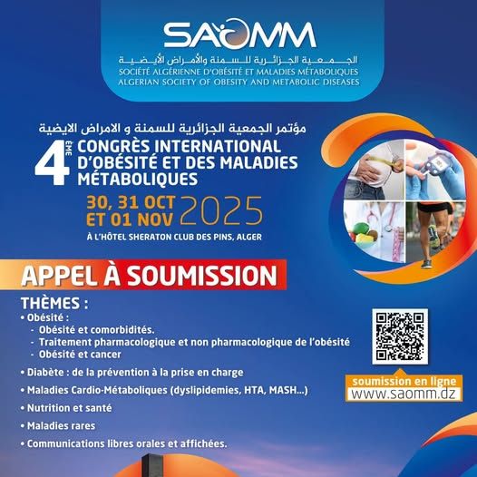 La Société Algérienne de l’Obésité et des Maladies Métaboliques (SAOMM), a le plaisir de vous informer de la tenue de son quatrième congrès international qui se déroulera