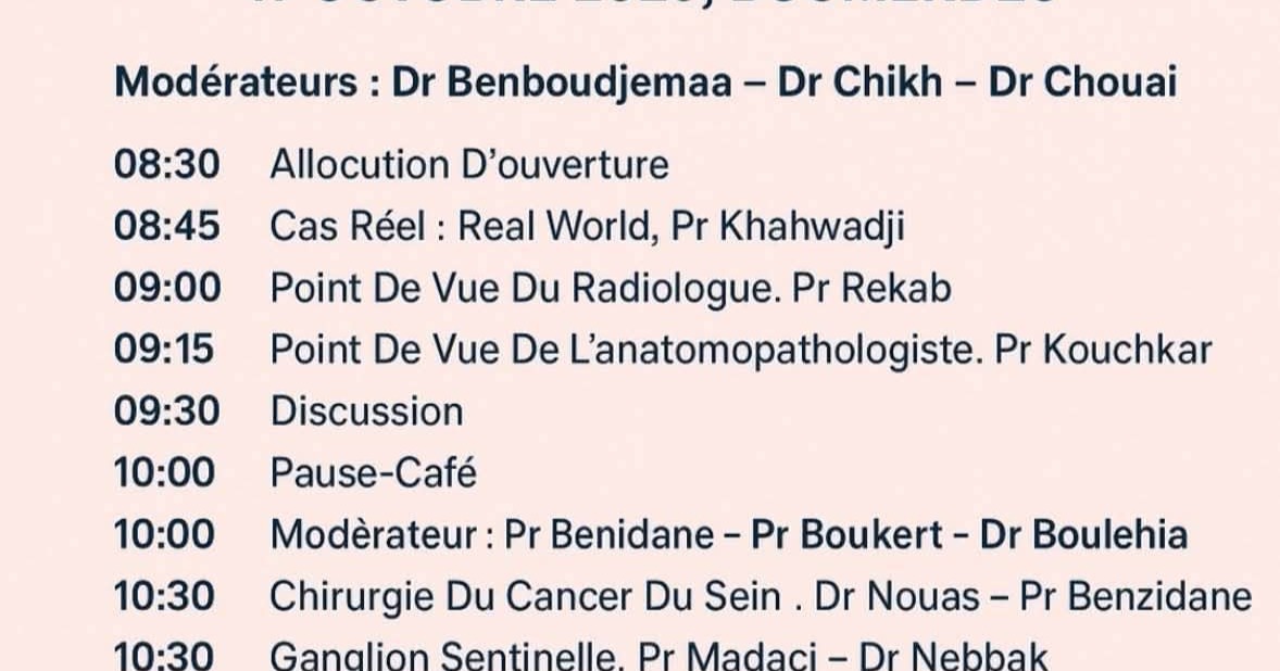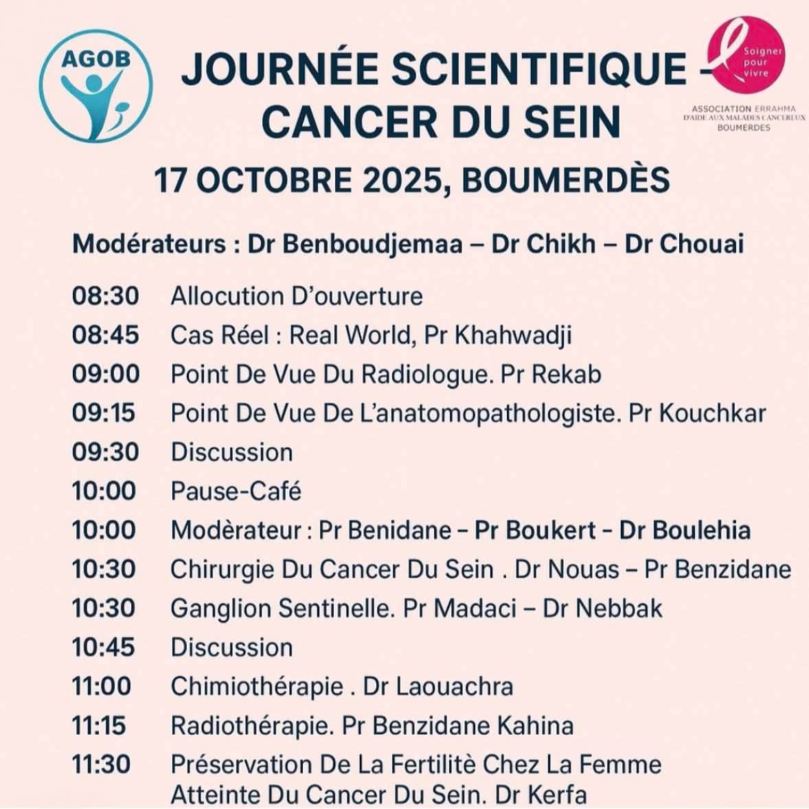 L’Association des Gynécologues et Obstétriciens de Boumerdès « AGOB » en đ€ collaboration avec l’Association Errahma, vous invite à une journée scientifique dédiée au cancer du sein đ rassemblant des experts multidisciplinaires pour partager leurs expériences et actualités sur :