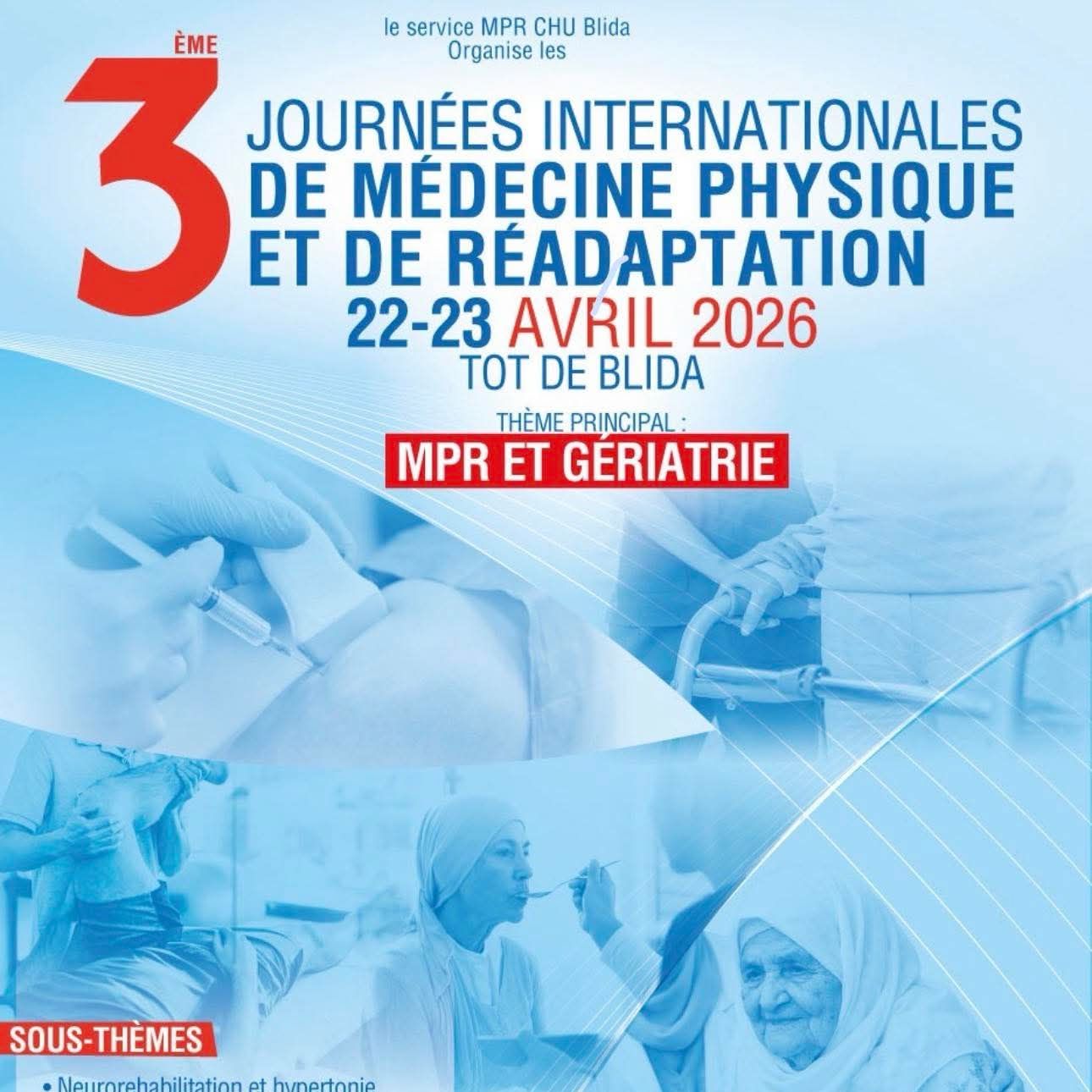يسرّنا كثيرًا أن نُعلمكم بتنظيم الطبعة الثالثة للأيام الدولية للطب الفيزيائي وإعادة التأهيل بالمركز الاستشفائي الجامعي بالبليدة، وذلك تحت رعاية Société Algérienne de Médecine Physique et de Réadaptation وعميد Faculté de Médecine de Blida.