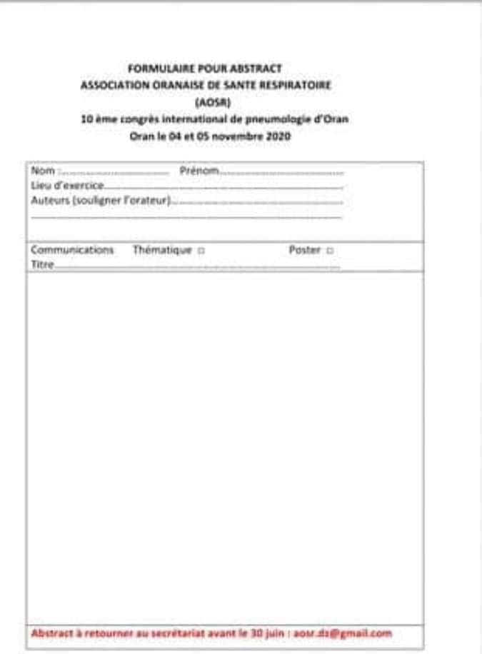 L'Association Oranaise de Santé respiratoire AOSR annonce le 10éme congrès International de Pneumologie ,le 04 et 05 novembre 2020 à Oran.